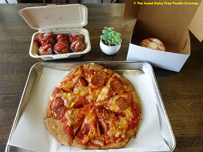I ended up getting their personal size Beyond Basic pizza with vegan pepperoni, vegan mozzarella and basil, which was simple delicious and the perfect size for lunch. I also got their Strawberry Cheesecake donut and their new fried donut holes pack of 6 of the Strawberry Lemon flavour with their cream cheese dipping sauce on the side. I am so in love with their fried donut holes, it was delicious I loved the strawberry drizzle on top and it was a good size and soft texture inside and the perfect bite. Highly recommend their fried donuts holes!! I can eat more than 6 lol 😂